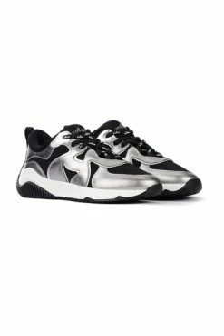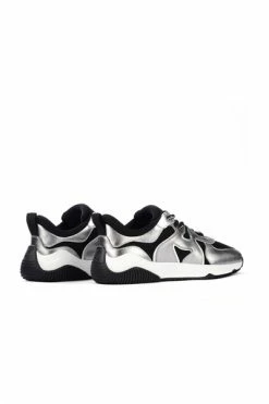 Hogan H597 sneaker in zilver en zwart leer en stof. Golvende zijde H Leather and Fabric Boven 8 mm Meminy Foam Insool Rubber Sole Made in Italy