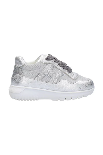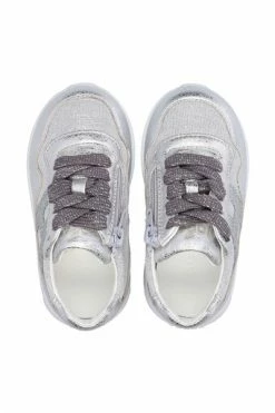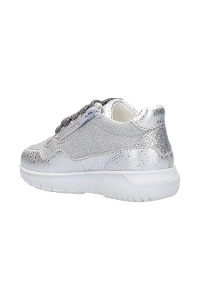 Hogan Sneakers Zilver – Bovenstuk in gelamineerd leer – Inzetstukken in lurex gemêleerde stof – Zijdelingse H en glitter details – Zijdelingse rits – Rubberen zool – Inclusief stoffen zakje