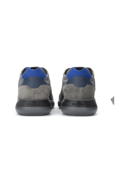 Trainer Hogan H371 Interactive³ In suede en grijze en blauwe stof. Blauwe lederen details. Lederen binnenzool 2 cm rubberen zool 3,5 cm gemaakt in Italië