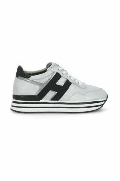 Hogan Sneakers Silver – Silver Hogan lederen sneakers voor vrouw – ronde teen – metalen lederen bovenste eith stoffen inzetstukken – zij contrasterende kleur