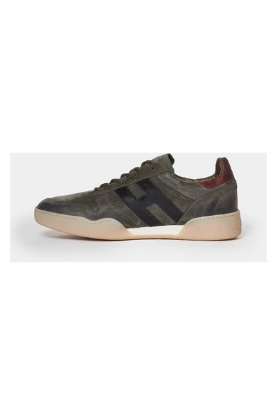Sneaker H357 Hogan Man Inspiration Vintage en hedendaagse ziel. Bovenkant in groen suède met zwarte H en Bourgondische spoor. Honing rubberen zool. Verwijderbare plantaire, comfortabele pasvorm.