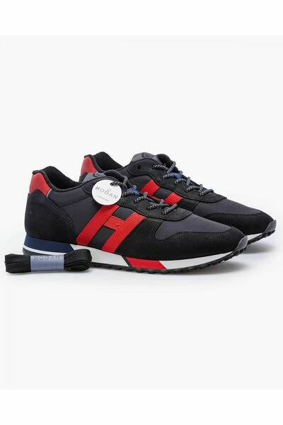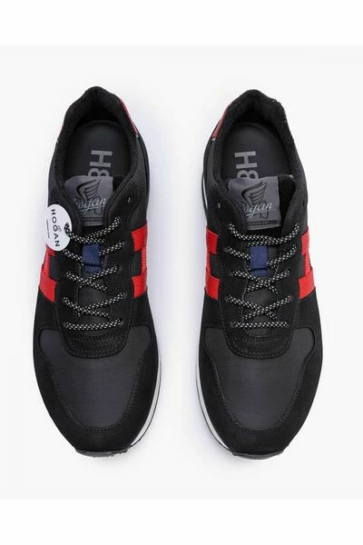 Zwarte leren en splitleren sneakers – H383 – van Hogan voor heren met contrasterende rode hielkap en H. De driekleurige zool is van rubber. Materiaal: nubuck Productstijl-ID: HXM3830AN51R75837F Deze beschrijving is automatisch vertaald.