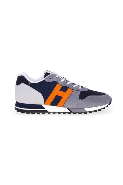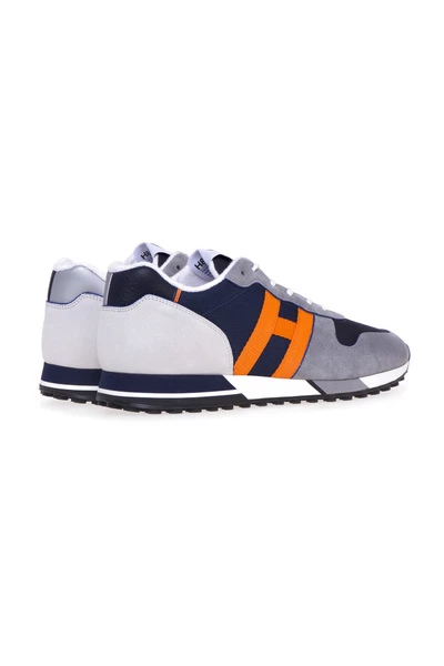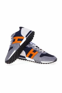 Marineblauwe sneakers met grijze inzetstukken, oranje H-logo, veters, oranje binnenkant. Materiaal: suède, leer Productstijl-ID: HXM3830DO92R7B662N Deze beschrijving is automatisch vertaald.
