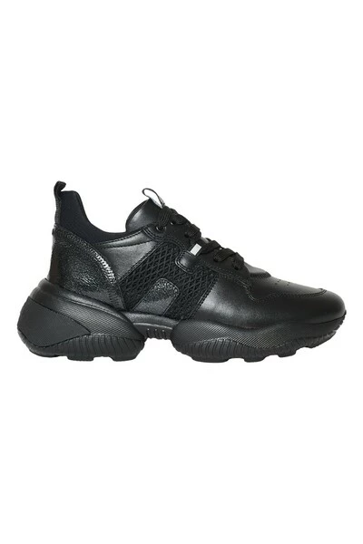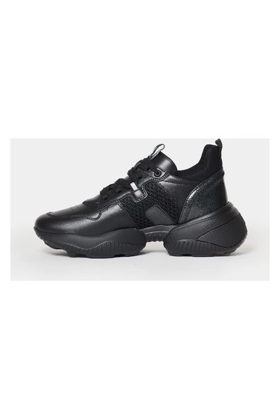 Sneaker Interactie Hogan vrouw gemaakt van zwart duikleer en stof. Craquelé lederen details. H side-raided h. FUSSBETT 5 mm in het geheugenschuim. Comfortabele pasvorm.