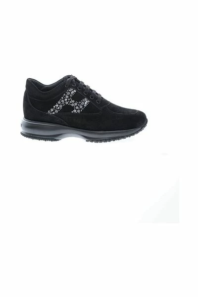 Collectie Schoenen AH19 / 20 sneaker / tennis Interactive Hogan zwart met uitsparingen en H versierd met kleine bloemen gemaakt van kleine stukjes metaal en roze staal. Of neus is Gemaakt van zwart gom van neus is 6 cm (Binnen + Buiten).