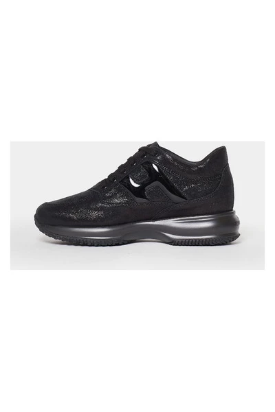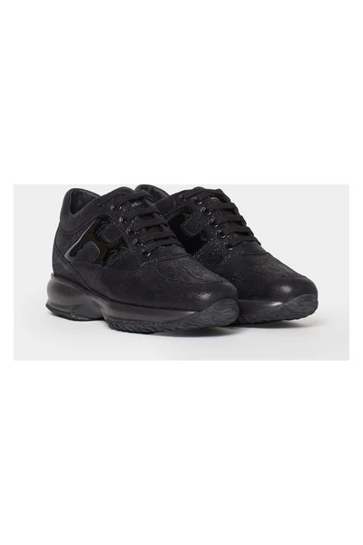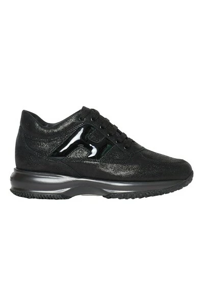 HOGAN interactieve vrouw sneaker met bovenste in suede zwarte stof print. H lateraal in zwarte verf. 1,2 cm Pull-Out Fussbett. Rubberen zool. Totale hoogte 5,7 cm. Groot fit, we raden aan om een ​​half aantal minder te bestellen.