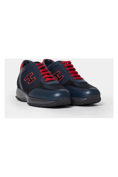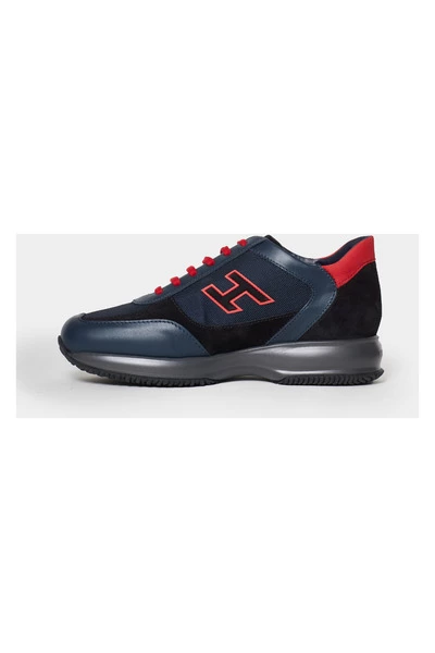 Hogan Interactive trainer met bovenwerk van leer en blauwe technische stof. Zwart suède details. Uitneembaar voetbed van 2 cm. Rubber zool. Wijde pasvorm.