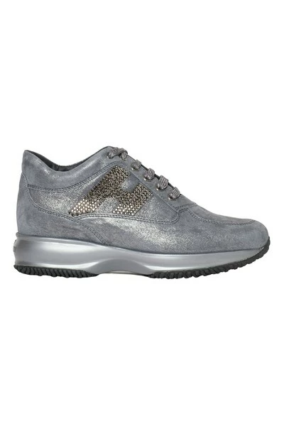 HOGAN interactieve vrouw sneaker. Bovenkant in gelamineerd grijs suède. H lateraal met steentjes. 1,2 cm Pull-Out Fussbett. Rubberen zool. Totale hoogte 5,7 cm.
