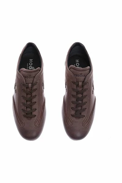 Collectie Schoenen bruine kleur ;Olympia; van Hogan in kalfsleer man schaatste met bezuinigingen en geborduurd logo ;H; toegepast en verweerd. Van Helft is in kauwgom.