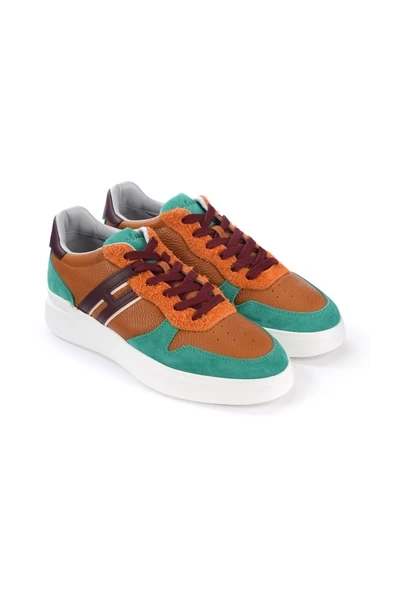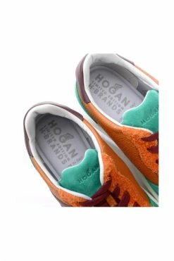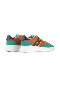 Hogan X H-merks sneaker H580 Model in lederen leer met oranje en groene suede details. H Lateral en hiel in Bordeaux lederen lederen interne pasta in traagschuim 1,5 cm rubberen zool 2,5 cm limited edition