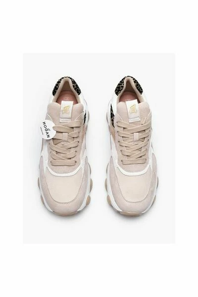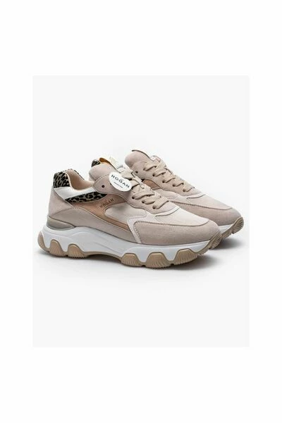 Collectie van damesschoenen sneakers – Hyperactive – Beige met Hogan Leopard Print voor vrouwen. Het paar bestaat uit verschillende panelen in verschillende materialen: lederen korst, leer, luipaard en textiel bedrukt fluweel. De twee -tone zool (beige en wit) is dik en gemaakt van kauwgom. De hiel meet 5 cm.