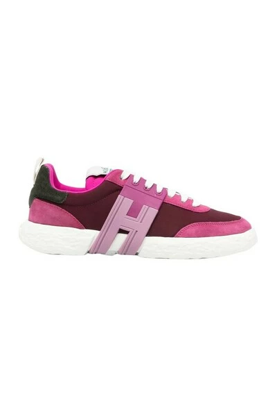 Hogan Sneakers 3R low-top sneakers van Hogan met Fuchsia roze, lila paars, wit, kalf suede, debosseerde logo aan de zijkant, logo-patch aan de tong, vooraan vaarten, ronde teen, pull-tab bij de hiel, gebrandmerk binnenzool en dikke rubberzool.