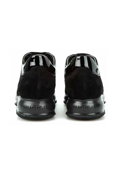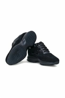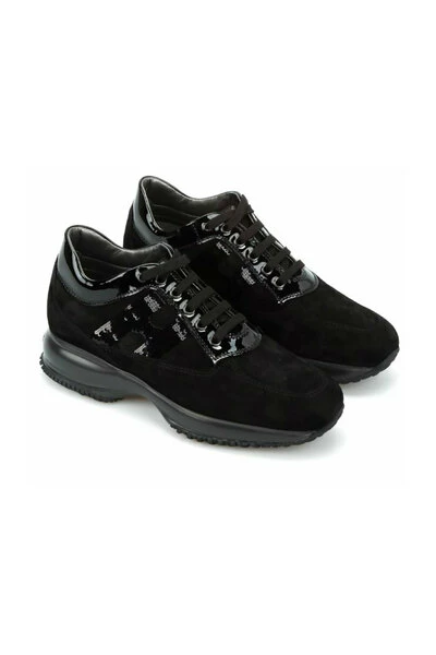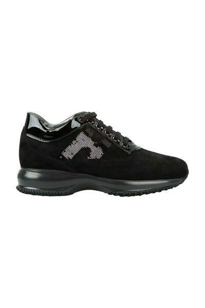 Interactief in suède met octrooi lederen details, blootgesteld stiksels en micro-lovertjes Hogan-monogram aan de zijkant. Easy-chic sfeer.