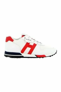 HOGAN Sneakers H383 Sneakers in witte en rode lederen bovenste, high-tech stof inzetstukken, suede detaillering, H aan de kant in Grosgrain, rubberen buitenzool