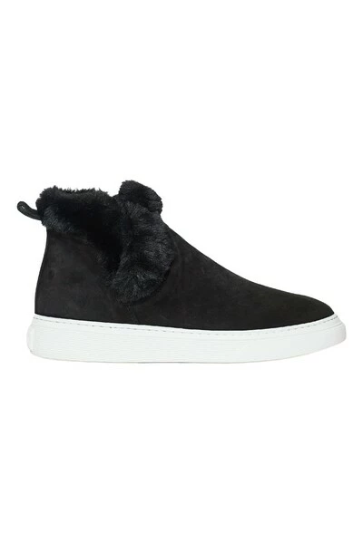 Hogan slip-on trainer in zwart suede met bontrand. Rubberen cassette zool. Uitneembaar anatomisch voetbed.
