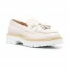 Blanches en veau grainé Cassetta de Hogan. Tennis voor dames, ultra-légèreus, gemaakt van één enkel stuk, met één enkele couture in de neus. De schoenen zijn geperforeerd voor het creëren van motieven, zoals de H aan de zijkant en met een zilverkleurige piqûre als versiering en een geelbruine rand rond het decolleté en aan de zijkant van de taal. De halve maan is 2, 5 cm.