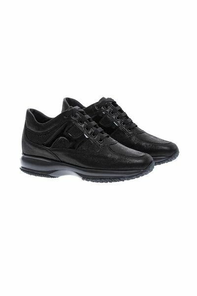 Collectie Schoenen Sneakers zwart ;Interactive; Hogan drachtige gedrukt fluweel voor vrouw met bezuinigingen en geborduurd logo ;H; in reliëf vernis. De zool is zwart tandvlees en het meten van 6cm hiel.