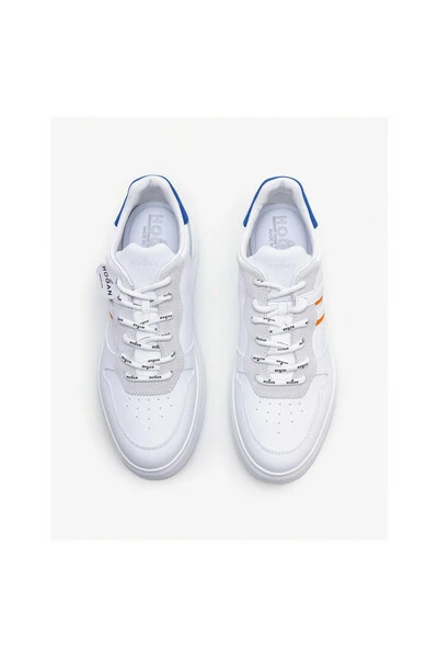 Collectie herenschoenen Nappa lederen sneakers en lederen korst – H580- Hogan voor mannen in witte kleuren met logo gemarkeerd in oranje en blauwe steunbeer. De zool is in rubber en meet 5 cm. Dit product is in het VK -grootte.