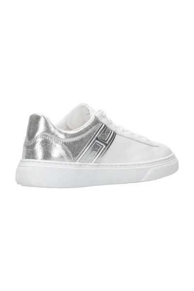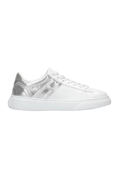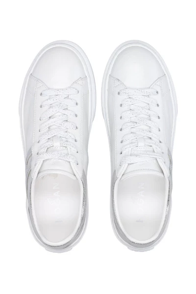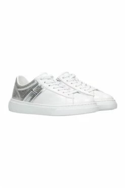 Hogan sneakers zilver – leer – semi -glanzende afwerking enigszins metalen – gelamineerde lederen inzetstukken – laterale H – verwijderbare interne kussen 1,3 cm – rubberen zool – enige hoogte: 3,5 cm – stoffen behuizing inbegrepen